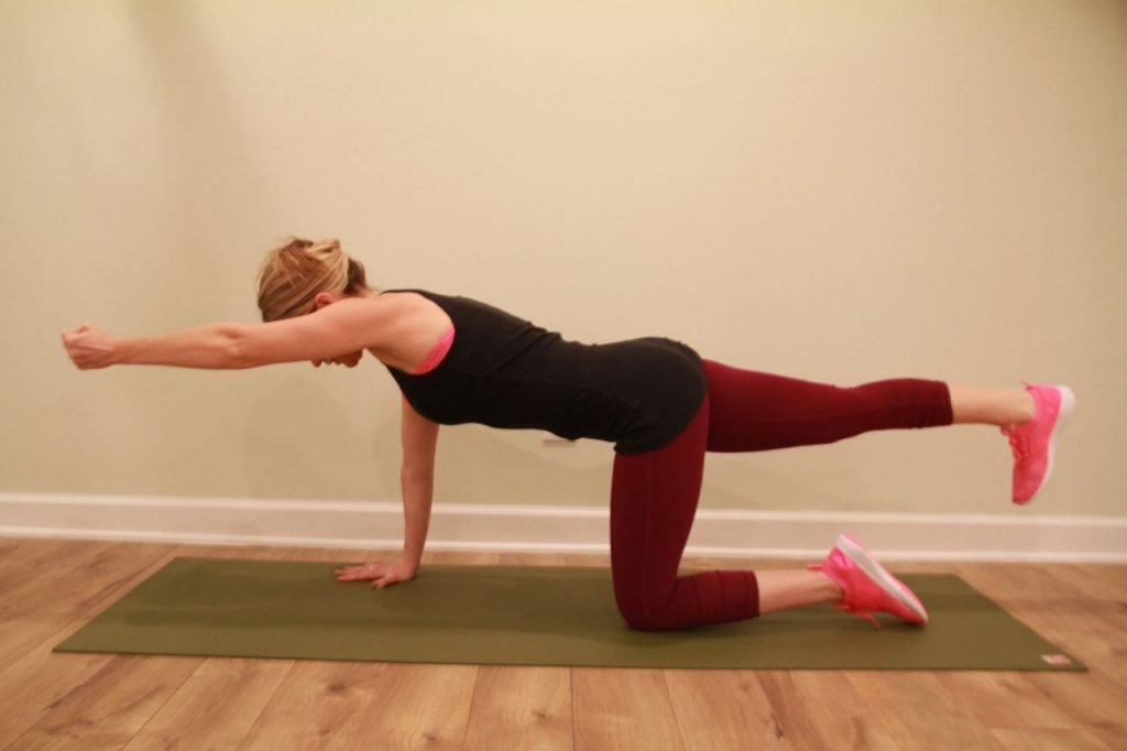 The next step in the starting position is to straighten one leg and the opposite arm so that it is in line with your back.